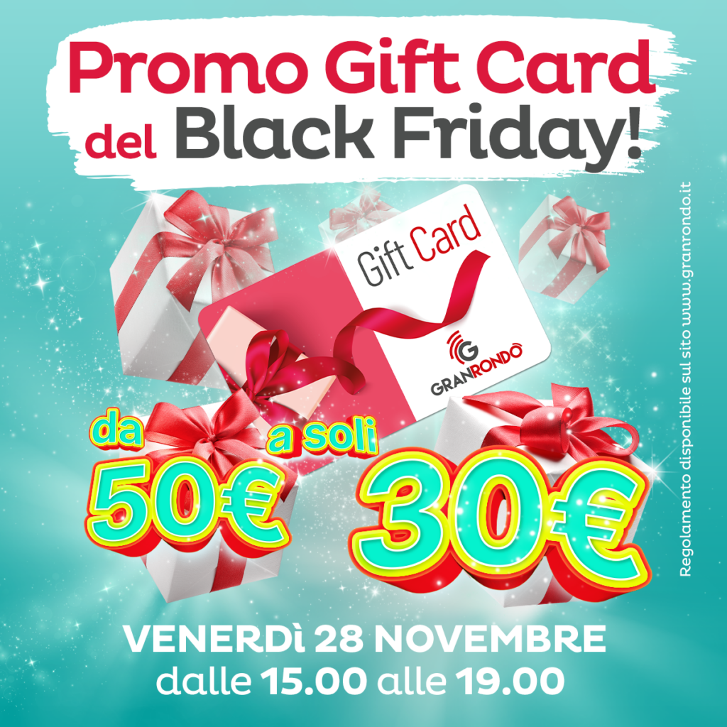 VENERDÌ 28 NOVEMBRE dalle 15.00 alle 19.00 è possibile acquistare ai totem digitali presenti in galleria una GIFT CARD del valore di 50€ A SOLI 30€. Regolamento completo QUI