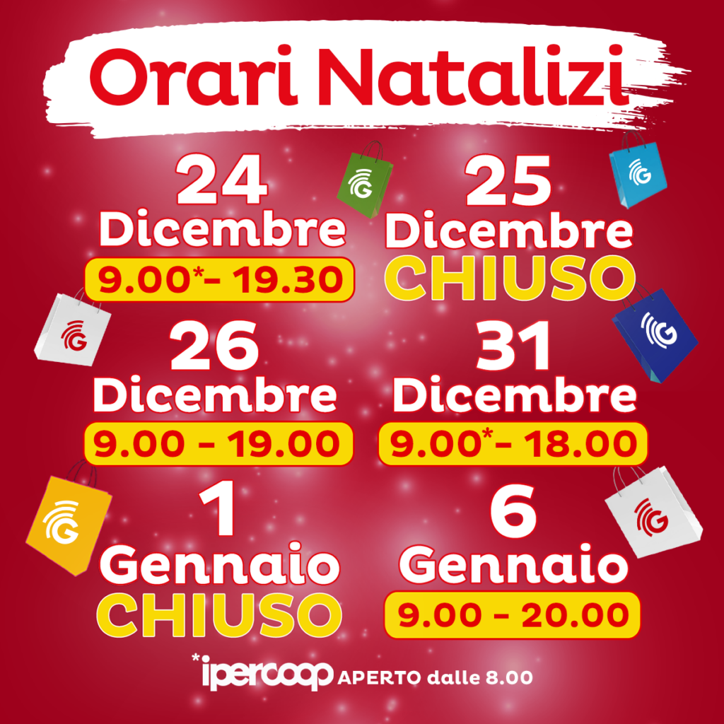 Domenica 24/12: 9:00 – 19:00*Lunedì 25/12: CHIUSIMartedì 26/12: 9:00 – 19:00Domenica 31/12: 9:00 – 18:00*Lunedì 1/01: CHIUSISabato 6/01: 9:00 – 20:00 *Ipercoop APERTO alle 8:30